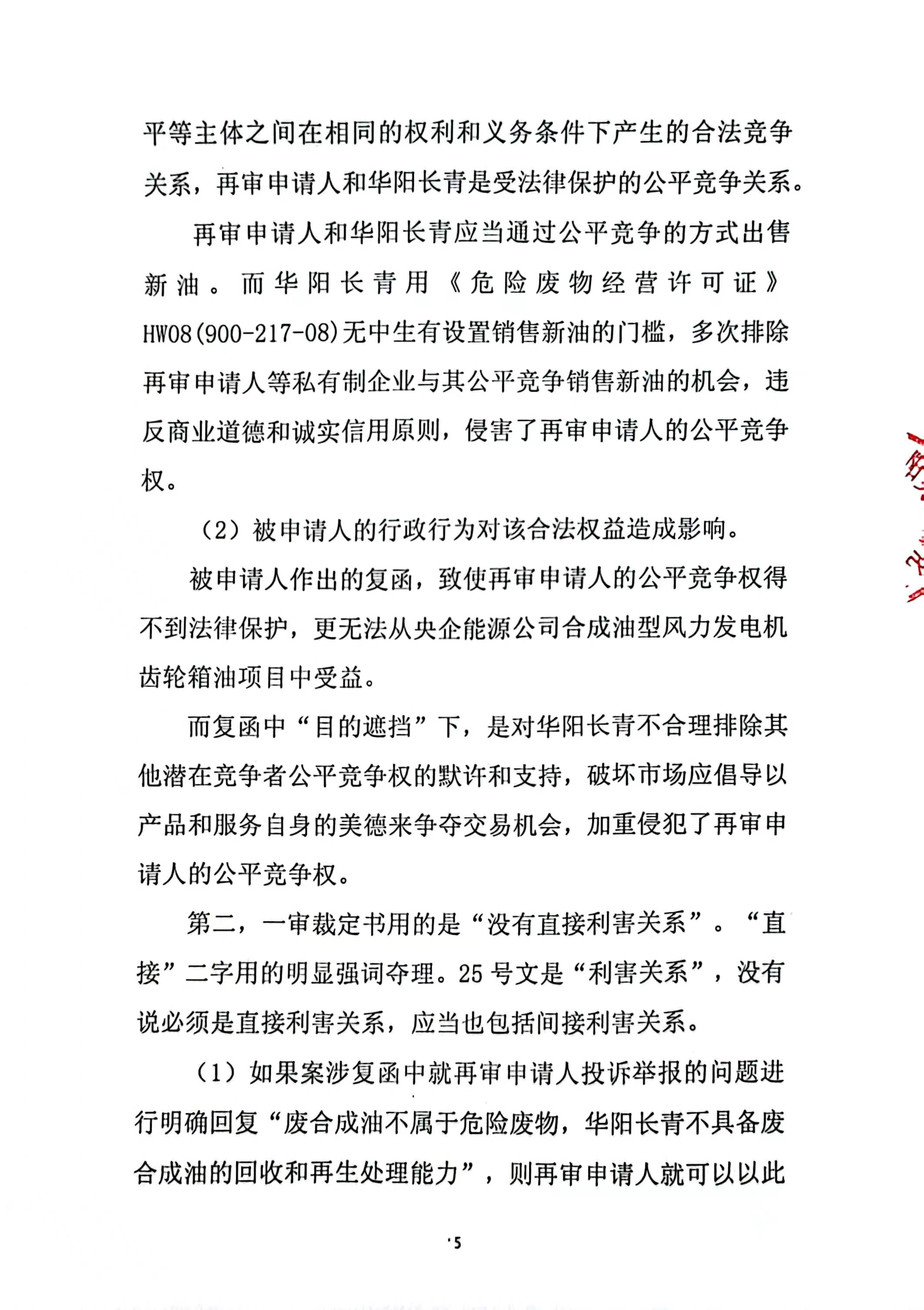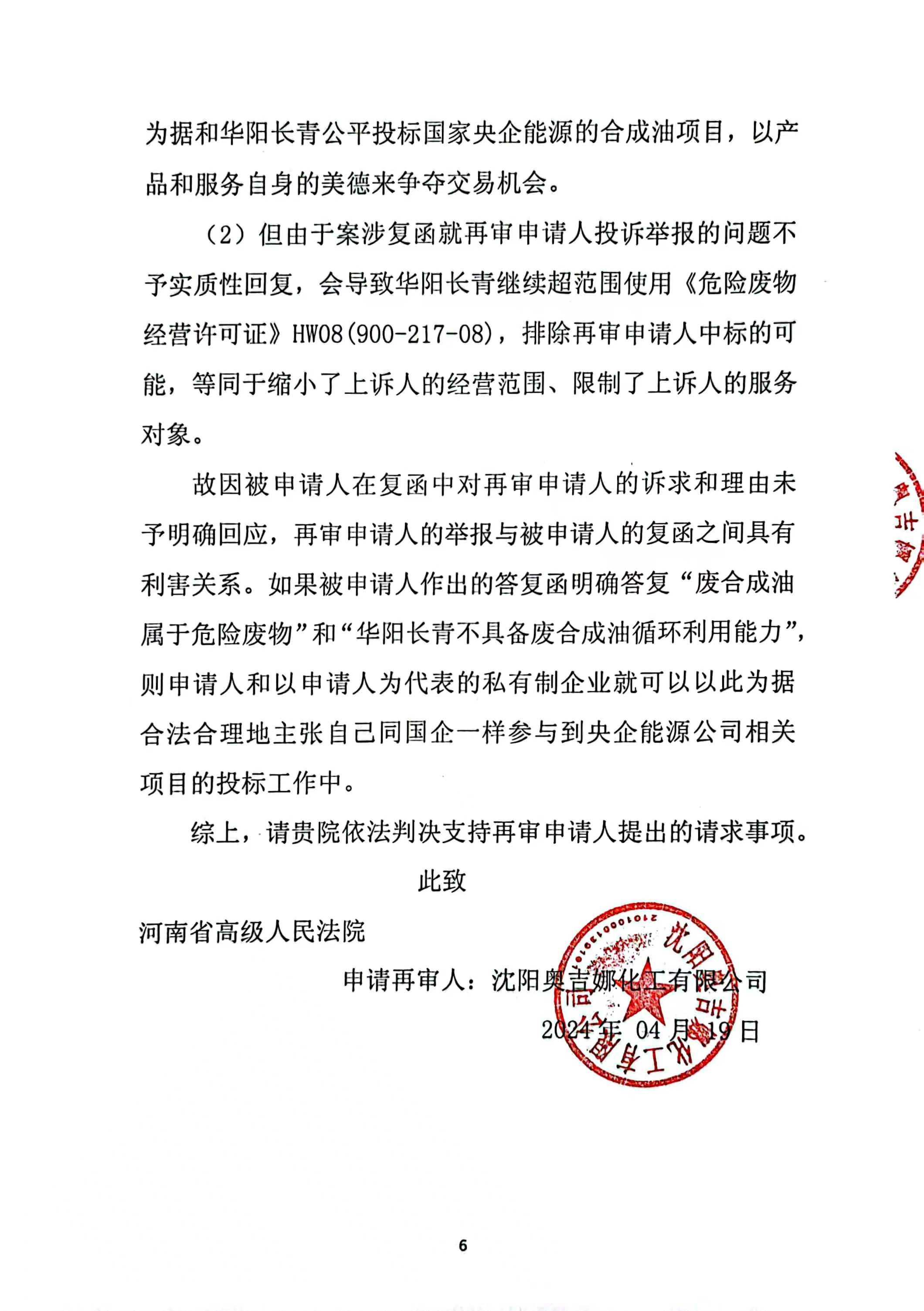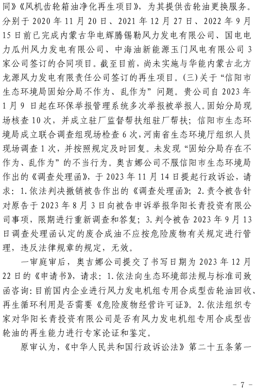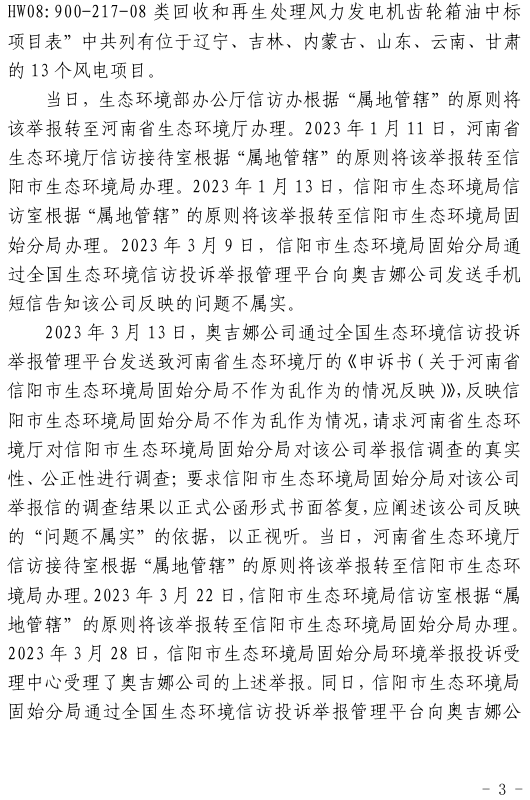 2023年3月9日,奧吉娜公司收到固始分局通過12369環(huán)境信訪平臺的短信答復:“反映問題不屬實”。3月10日,奧吉娜公司向固始分局負責人電話詢問,其解釋稱:經(jīng)調(diào)查核實,華陽長青公司沒有再生風電潤滑油銷售,出售的是新油。否定了奧吉娜公司的舉報內(nèi)容。對此,奧吉娜公司表示強烈不滿。3月11日,奧吉娜公司向環(huán)境部投訴固始分局的不作為和亂作為。2023年5月26日,奧吉娜公司收到12369環(huán)境信訪平臺的短信答復。答復部門為信陽環(huán)境局。令人啼笑皆非的是,答復稱,華陽長青的許可證有效期沒有問題,與舉報內(nèi)容風馬牛不相及。2023年6月13日,奧吉娜公司再次向環(huán)境部提出申訴,指出,奧吉娜舉報的不是許可證有效期問題,而是許可證的適用范圍錯誤、違法。2023年7月27日,奧吉娜公司收到回復稱,經(jīng)信陽市生態(tài)環(huán)境局現(xiàn)場檢查,未發(fā)現(xiàn)固始分局不作為情況。2023年8月3日,奧吉娜公司向河南省生態(tài)環(huán)境廳(以下稱:環(huán)境廳)舉報信陽環(huán)境局包庇固始分局的行為。環(huán)境廳對此高度重視,有關(guān)處長和奧吉娜公司負責人進行了面談。2023年9月13日,信陽環(huán)境局向奧吉娜公司致《信陽市生態(tài)環(huán)境局關(guān)于沈陽奧吉娜化工有限公司舉報華陽長青投資有限公司違法經(jīng)營及固始分局不作為、亂作為等問題調(diào)查處理的函》。函中:一是,以“齒輪箱”替換“齒輪箱油”,偷換概念;二是,做出了廢風電合成(齒輪)油不屬于危險廢物的結(jié)論;三是,未發(fā)現(xiàn)固始分局存在不作為、亂作為的不當行為。再次否定奧吉娜公司的舉報和投訴。