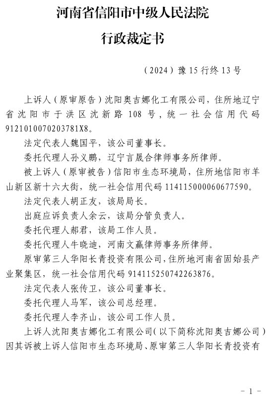 中國風電潤滑油民營企業(yè)沈陽奧吉娜化工有限公司(下簡稱:奧吉娜公司或上訴人)訴信陽市生態(tài)環(huán)境局(被上訴人)和第三人華陽長青投資有限公司(下簡稱:華陽長青公司)行政訴訟案,河南省信陽市中級人民法院于2024年4月2日作出二審行政裁定:駁回上訴,維護原裁定。