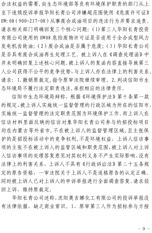 2、一審訴訟請求:請求人民法院判決撤銷被告作出的《信陽市生態(tài)環(huán)境局關(guān)于沈陽奧吉娜化工有限公司舉報華陽長青投資有限公司違法經(jīng)營及固始分局不作為、亂作為等問題調(diào)查處理的函》;責令被告對原告向被告舉報華陽長青投資有限公司事項,限期進行重新調(diào)查和答復;判令被告認定的廢合成油不應(yīng)按危險廢物有關(guān)規(guī)定進行管理違反法律規(guī)章規(guī)定,無效。